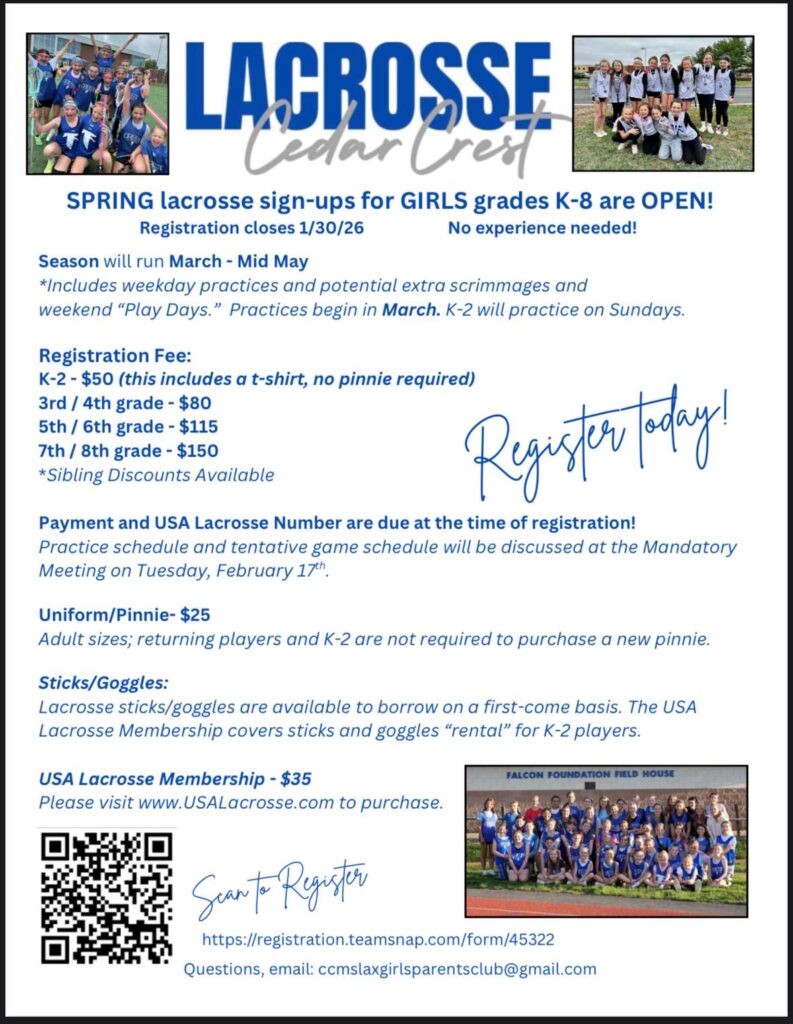 Cedar Crest Youth Girls Lacrosse Website: Spring 2026 RegistrationDates: February 2026 – May 2026Grades: K – 8thContact: CCMSLAXGirlsParentsClub@gmail.com